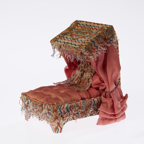 Doll sized canopied bed made from Max Mints confectionary wrappers over a frame of Max Mints cardboard box parts. Bed is fitted with pink satin-like fabric drapes from side of canopy falling to loose pleats, pink fabric bolster cushion and padded buttoned mattress. Two kewpie dolls lean on the cushion, dressed in Max Mints wrapper nightdresses trimmed with lace. Mattress has paper buttons and edge of bed and canopy trimmed with fringed Max Mints wrappers. Fabric drapes are tied back with crocheted chain pinned to bed. Dolls' faces are painted.