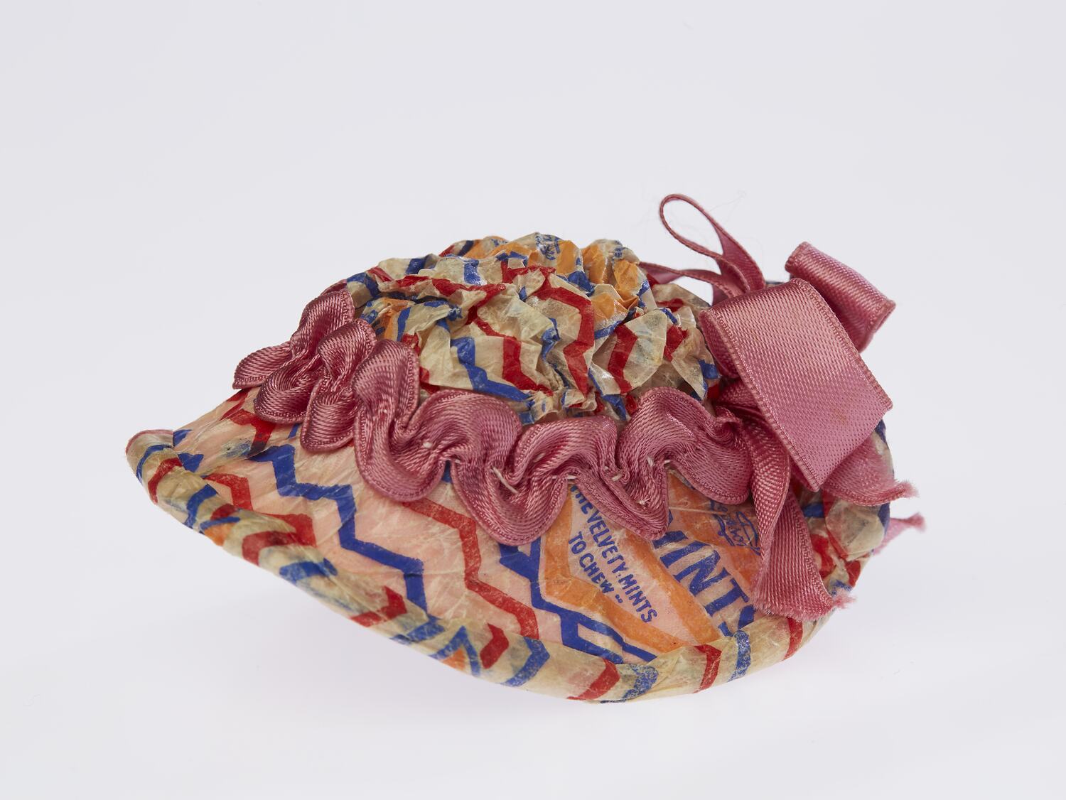 Doll size bonnet made from wire and ribbon frame covered with Max Mints confectionary wrappers. Hat has brim upturned at one end. Pink ribbon sewn into tight wavy undulations around band. Ribbon in bows also on either side of upturned brim. Crown of hat stitched into ruffles and pleats. Hat hand sewn and constructed.