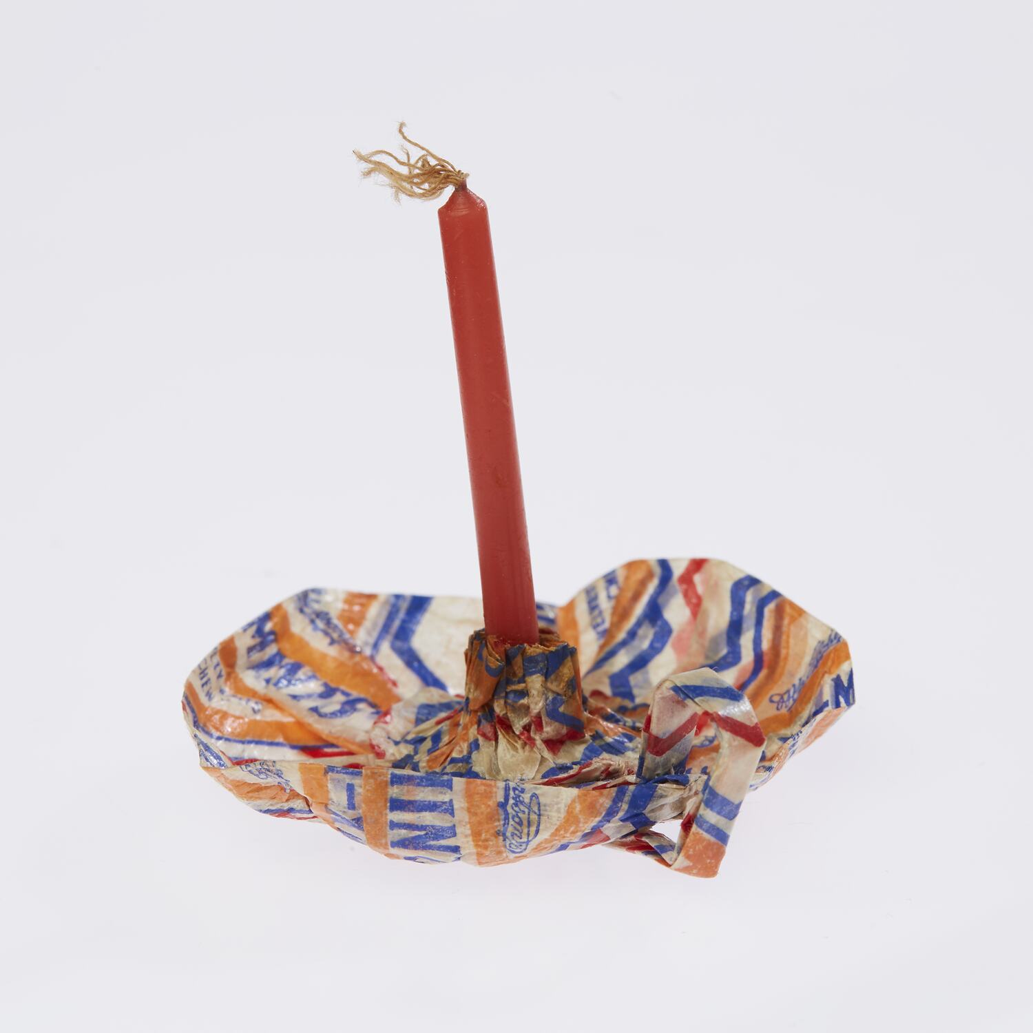 Miniature candle stick holder made from folded and stitched Max Mints confectionary wrappers. Wrappers are formed into a flat circular shape with up turned rim and looped holder at edge. A dark pink wax birthday cake candle is held in the centre with paper wrapped around base.