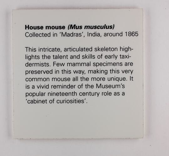 House Mouse (Mus musculus) / Collected in 'Madras', India, around 1865 / This intricate, articulated skeleton highlights the talent and skills of early taxidermists. Few mammal specimens are preserved this way, making this very common mouse all the more unique. It is a vivid reminder of the Museum's popular nineteenth century role as a 'cabinet of curiosities'.