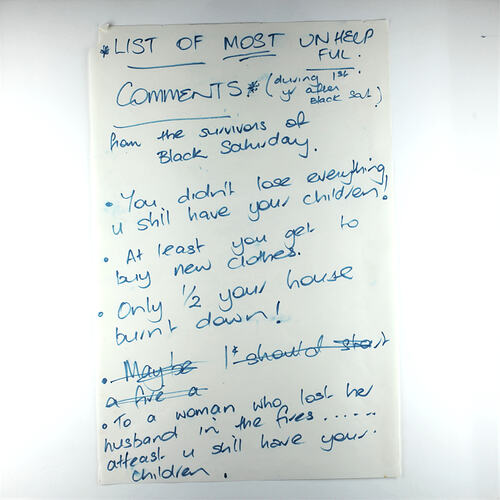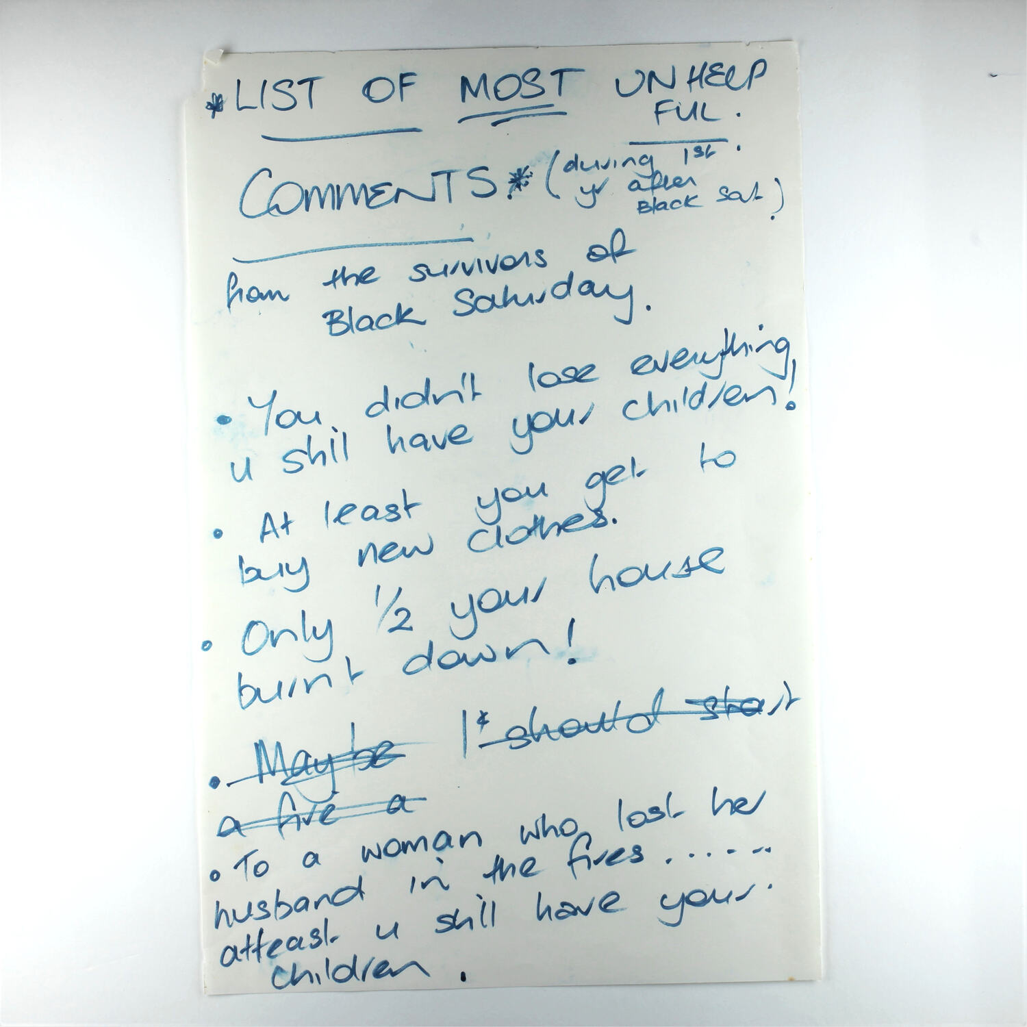 *LIST OF MOST UNHELPFUL / COMMENTS* (during 1st yr after Black Saturday) / from the survivors of / Black Saturday. / - You didn't lose everything / u still have your children! / - At least you get to / buy new clothes / - Only 1/2 your house / burnt down! / - To a woman who lost her / husband in the fires ...... / at least u still have your / children.