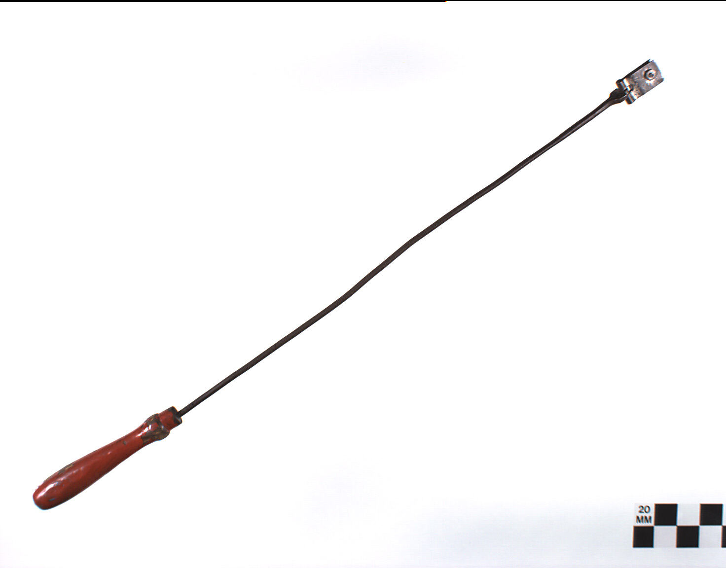 A metal rod with a turned wooden handle at one end, painted red. The other end of the rod has been flattened and has a hinged, double- leaved flap attached. There is a small hole in each "leaf", which fits around similarly sized holes in the puppets. A screw, fastened with a nut, attaches the rod to the puppet. The screw and nut are attached.