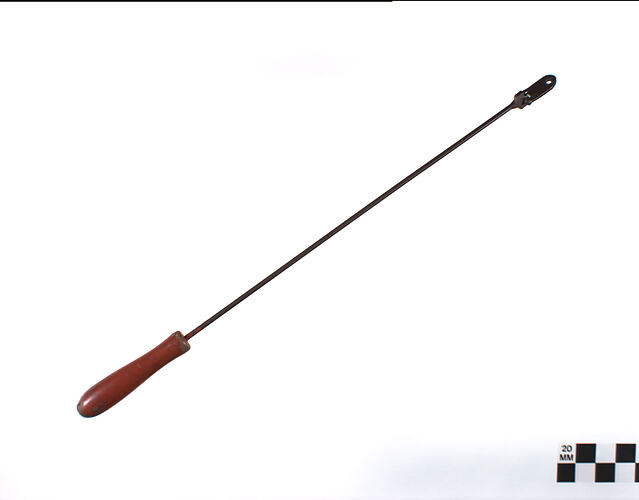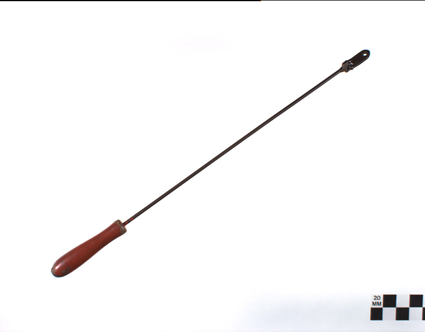 A metal rod with a turned wooden handle at one end, painted red. The other end of the rod has been flattened and has a hinged, double- leaved flap attached. There is a small hole in each "leaf", which fits around similarly sized holes in the puppets. A screw, fastened with a nut, attaches the rod to the puppet. The screw and nut are attached.