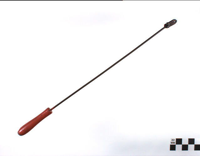 A metal rod with a turned wooden handle at one end, painted red. The other end of the rod has been flattened and has a hinged, double- leaved flap attached. There is a small hole in each "leaf", which fits around similarly sized holes in the puppets. A screw, fastened with a nut, attaches the rod to the puppet.