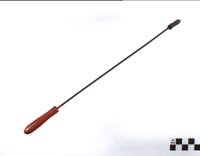 A metal rod with a turned wooden handle at one end, painted red. The other end of the rod has been flattened and has a hinged, double- leaved flap attached. There is a small hole in each "leaf", which fits around similarly sized holes in the puppets. A screw, fastened with a nut, attaches the rod to the puppet.
