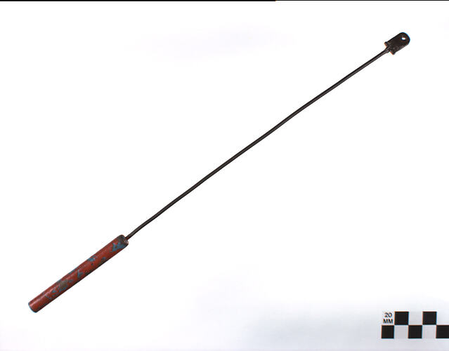A metal rod with a turned wooden handle at one end, painted red. The other end of the rod has been flattened and has a hinged, double- leaved flap attached. There is a small hole in each "leaf", which fits around similarly sized holes in the puppets. A screw, fastened with a nut, attaches the rod to the puppet. Remnants of blue paint are visible on the handle.