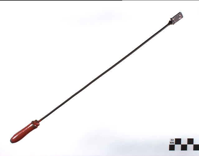 A metal rod with a turned wooden handle at one end, painted red. The other end of the rod has been flattened and has a hinged, double- leaved flap attached. There is a small hole in each "leaf", which fits around similarly sized holes in the puppets. A screw, fastened with a nut, attaches the rod to the puppet. The nut and screw remain in the holes.