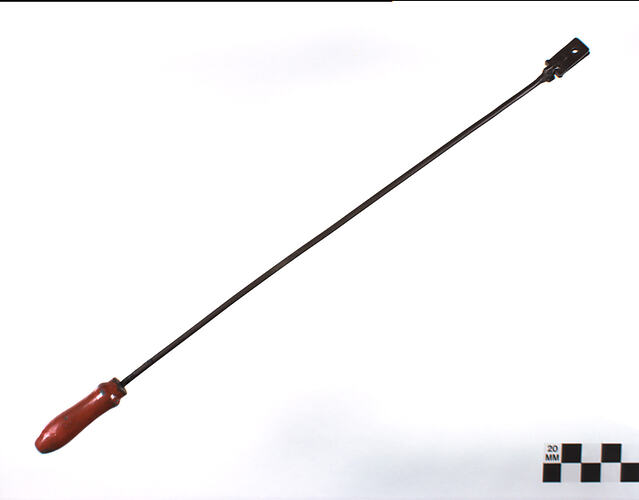 A metal rod with a turned wooden handle at one end, painted red. The other end of the rod has been flattened and has a hinged, double- leaved flap attached. There is a small hole in each "leaf", which fits around similarly sized holes in the puppets. A screw, fastened with a nut, attaches the rod to the puppet. Some blue paint remains under the red on the handle.