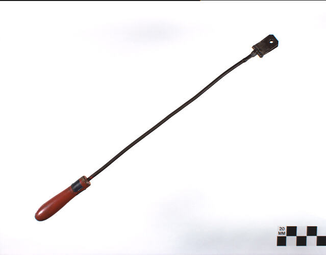 The puppet rod is integral to all performance of traditional Greek Shadow Puppet Theatre.The puppet rod is fitted to the shoulder of the puppet (and also the hand of the long arm of the character Karaghiozis) so that the puppeteer can move it around the stage on the screen. The puppet rod is the most basic tool used by the puppeteer. Until 1924 the puppet was nailed to a wooden rod approximately 50cm long with which it was manoeuvred around the stage. It had one basic disadvantage in that the puppet couldn't be flipped to exit the stage, so the puppet exited the stage by walking off backwards. Due to this limitation, in order for the puppet to respond to or commence dialogue with another puppet standing behind it, the puppeteer would lean the top part of the puppet backwards. Due to this shortcoming, the puppeteer's assistants that affixed the rods to the puppets had to know the play well to know which way the puppet entered or exited the stage during the performance so they could affix it facing the correct way. This type of rod was used by all Karaghiozis puppeteers in the Art of Shadow Puppet Theatre, and although the wooden rods did evolve over time to enable the puppet to be flipped around, everything changed in 1924 with the puppeteer Lefteri Kelarinopoulos' discovery of the rivet. The puppets were finally able to be manoeuvred in any direction. The rods in the Museum's collection are the final form of the puppet rod created by puppeteers. It is smaller and perfected and permanently incorporates the metal hinge control on one end and a wooden handle on the other end which it is held by the puppeteer.