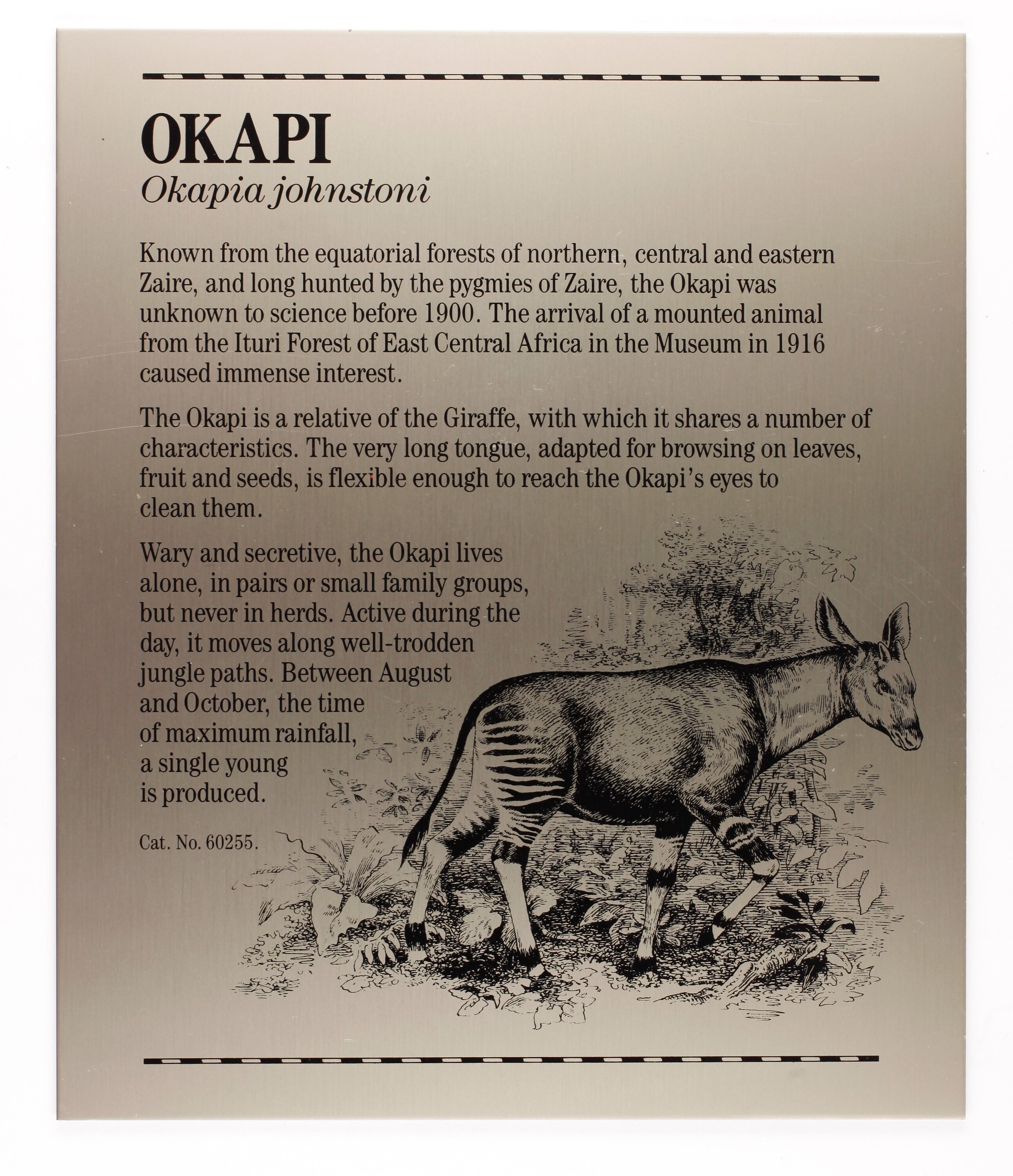 Rectangular label, vertical, single-sided with black printed on metal sheet. Upper and lower case TNR font with top and bottom border line. Illustration of the Okapi in jungle printed on bottom right Remnants of adhesive still on back.