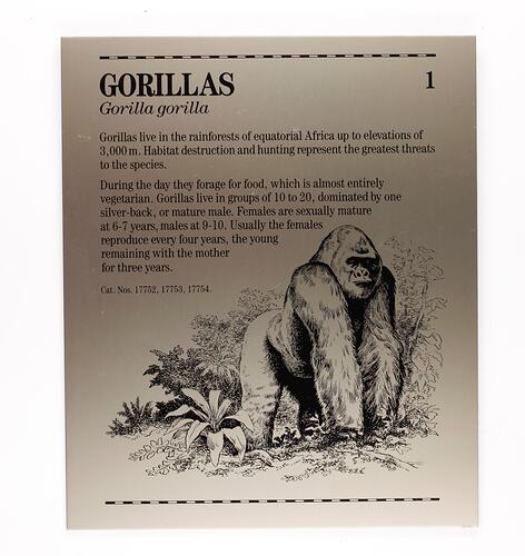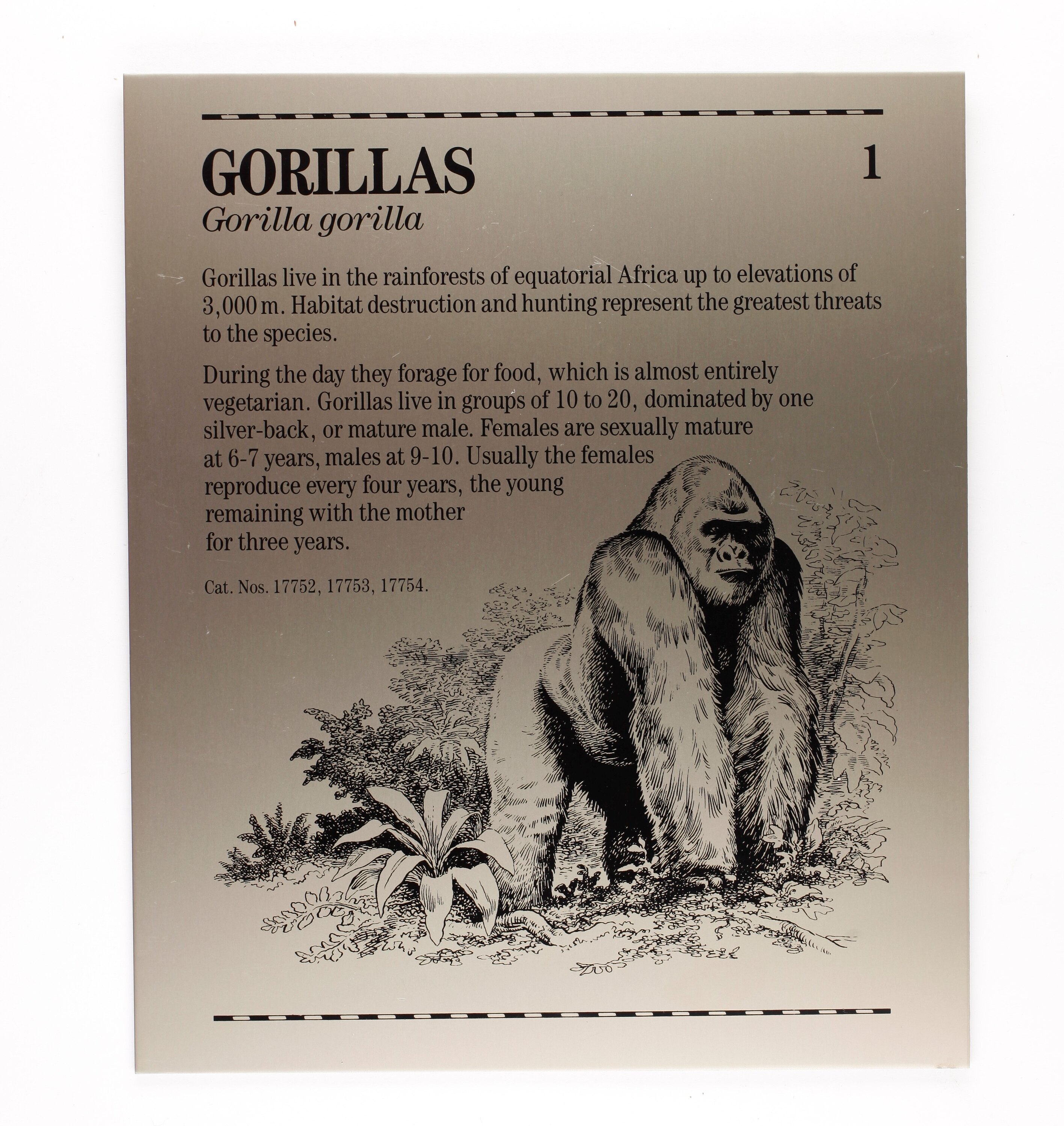 Exhibition label for the Gorilla display at Museum of Victoria, circa 1985.