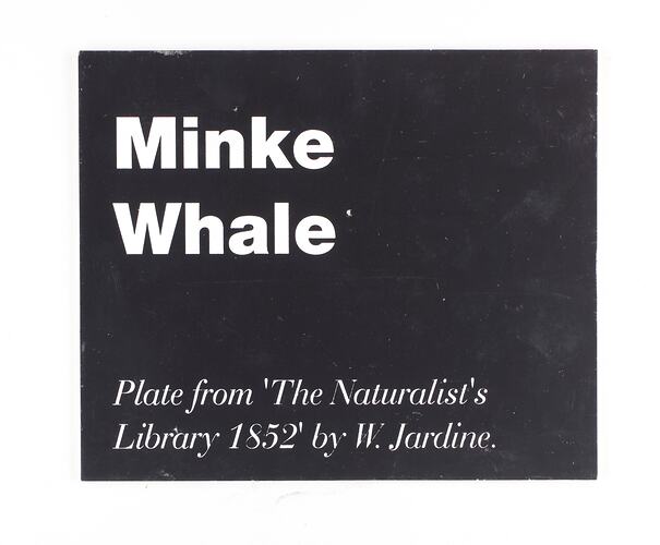 Exhibition label for the Minke Whale display at Museum of Victoria, Melbourne, circa 1990.