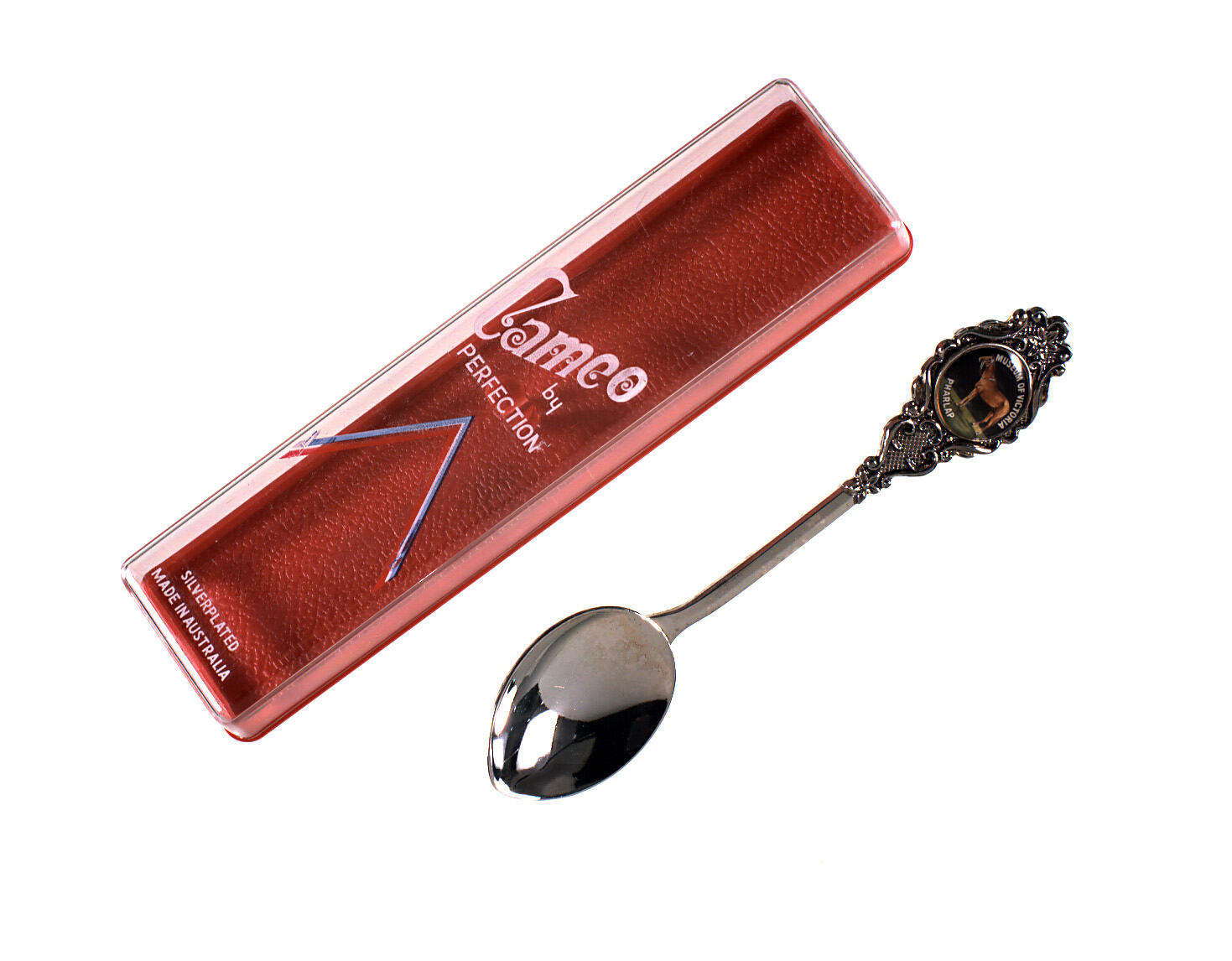 Metal souvenir spoon with cameo of Phar Lap on front of handle. Embossed cameo of woman on back of handle. Scrolls around both sides of handle. .2 & .3: Plastic case for spoon. Red plastic case with clear lid . Bottom of case has 2 prongs by which to hold the spoon.