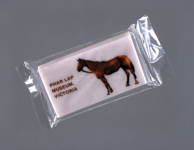 This small rubber eraser is an example of the Phar Lap related merchandise sold in the Museum of Victoria shop in the 1980s.