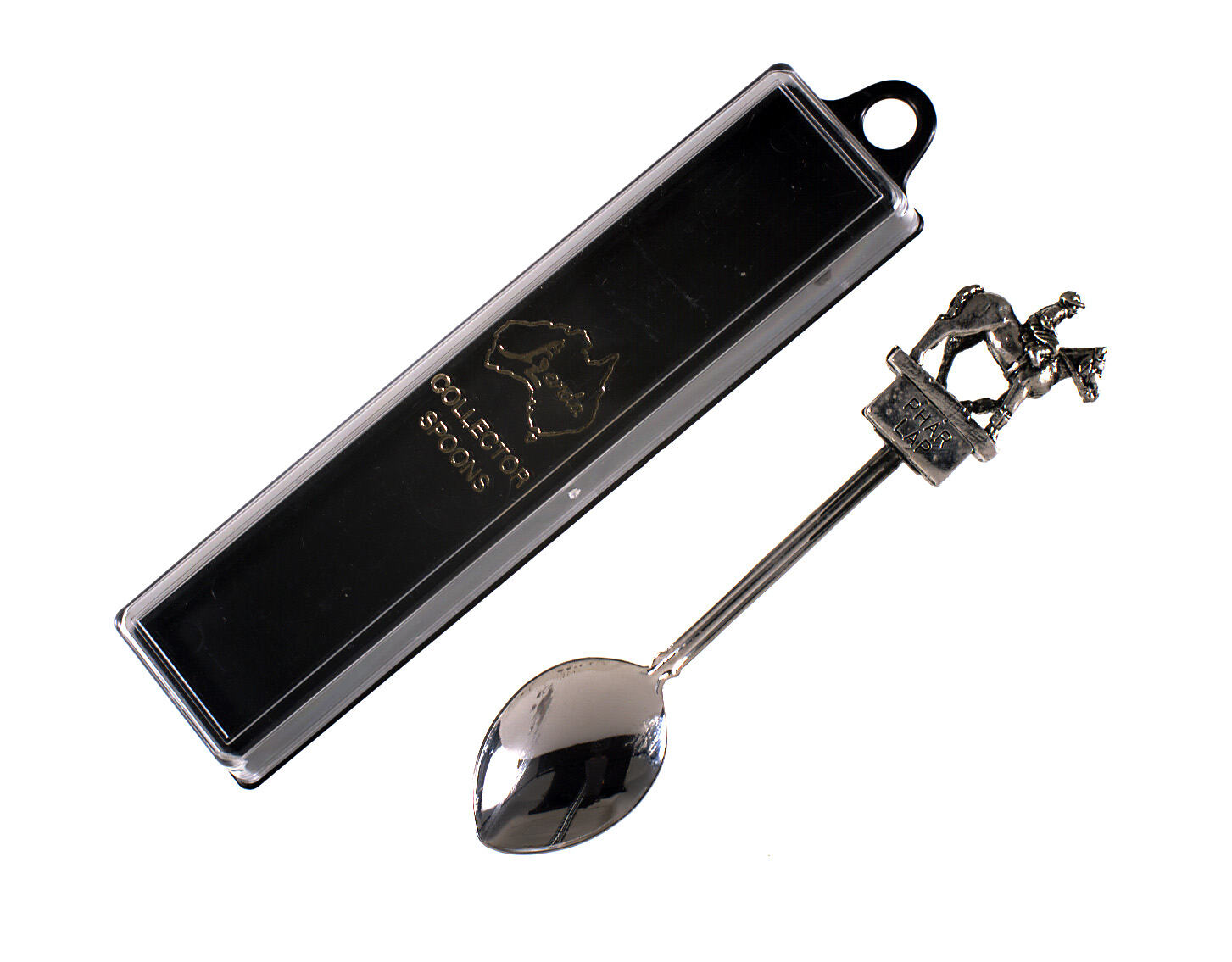 Silver plated metal spoon in plastic case. Consists of: 1 Metal spoon with horse and rider on top, with the words 'Phar Lap' inpressed below. .2 Black plastic base of case. 3 Clear plastic top of case.