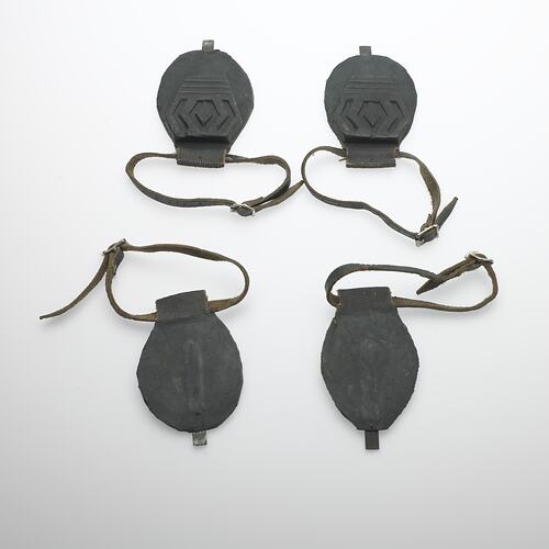 Set of rubber soles each consisting of an oval black rubber hoof cover attached to a brown leather strap. Hoof cover has a raised section with four grooves cut in. The sole is re-enforced with a thin metal strip which protrudes from the front of the sole. The leather strap is fastened by a metal buckle. There are eleven holes in the strap.