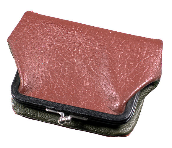 Purse made from red and green leather, with metal frame, made by Simpson's Gloves Pty Ltd, Richmond, 1950s-1960s.