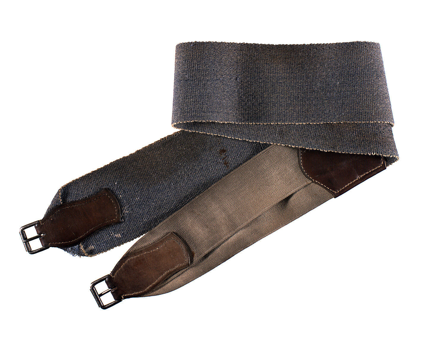 Long rectangular girth strap made from blue hessian with dirty white elastic and leather at join of materials and near buckles.
