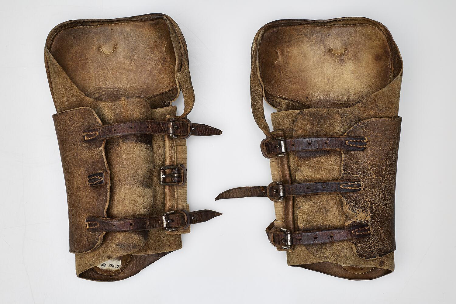 Pair of leather horse shin pads worn by the racehorse Phar Lap in the 1930s.