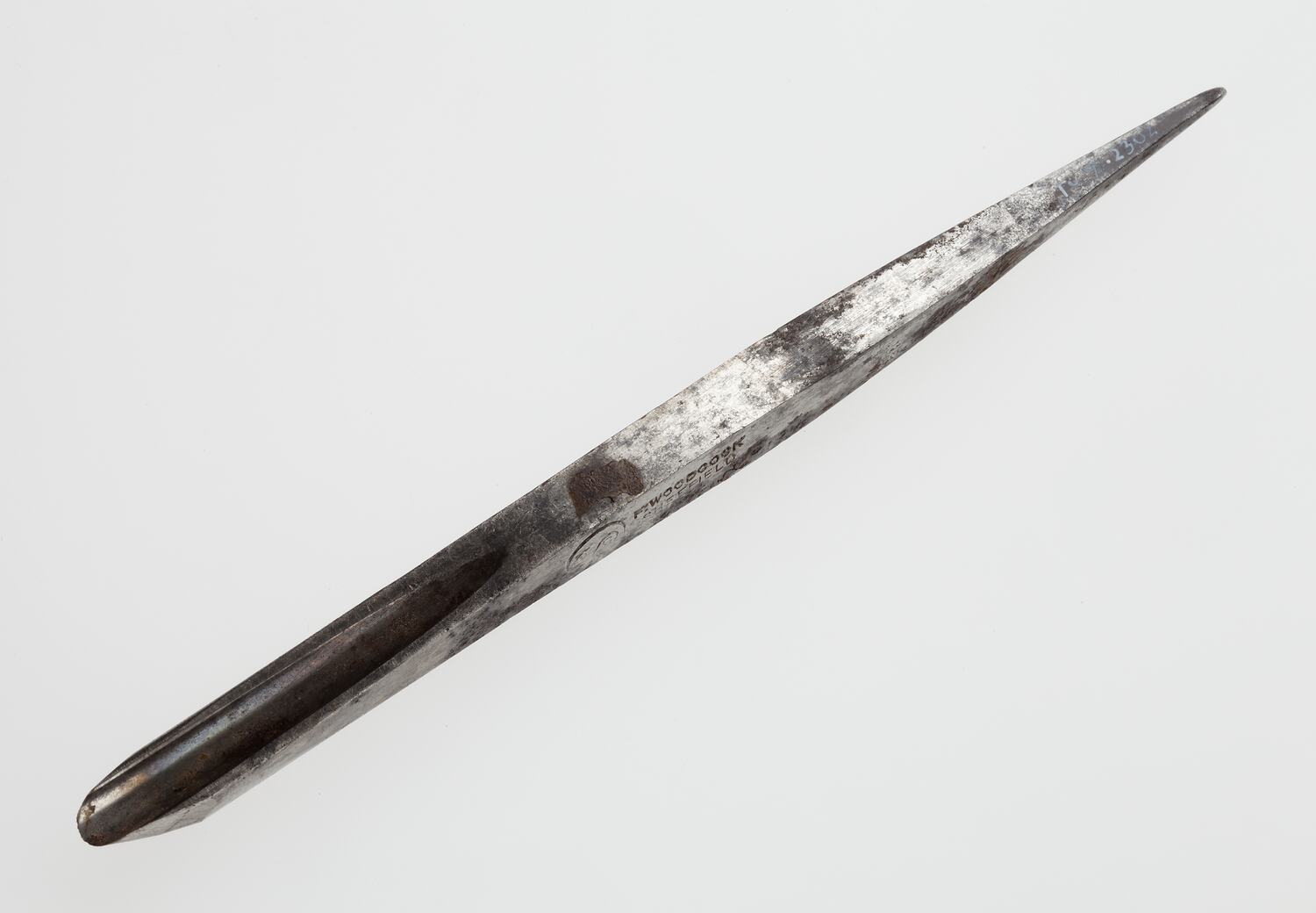Round-nosed spindle gouge. The steel blade at the shank end is pointed to enable it to be attached to a wooden handle.