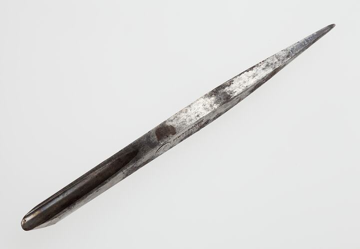 Turning Gouge made by F. Woodcock circa 1890s-1950s. It was found in Area B1 at Adolph Bruhn & Son's Wood Turners Shop, 283 Coventry Street, South Melbourne. The business was established by Adolph Bruhn circa 1893 in Little Collins Street, Melbourne. Upon his death in 1919 it was then operated by Adolph's son Sophus Christopher Bruhn. Upon Sophus's death in 1959 his son Sophus Walter Bruhn took over the business. In 1970 Sophus reduced the scale of the business and relocated to South Melbourne. The business closed upon Sophus's death in January 1990.