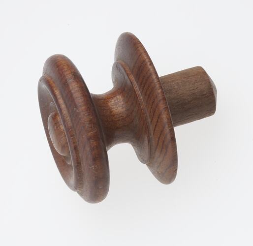Wooden door knob created by Adolph Bruhn & Son, circa 1970 - 1990. It was found in a pile of woodturned objects in Area B2 at Adolph Bruhn & Son's Wood Turners Shop, 283 Coventry Street, South Melbourne. The business was established by Adolph Bruhn circa 1893 in Little Collins Street, Melbourne. Upon his death in 1919 it was then operated by Adolph's son Sophus Christopher Bruhn. Upon Sophus's death in 1959 his son Sophus Walter Bruhn took over the business. In 1970 Sophus reduced the scale of the business and relocated to South Melbourne. The business closed upon Sophus's death in January 1990.