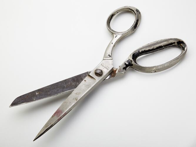 Dressmaker's scissors, made in Italy circa 1970 - 1990. They were found in a basket (SH912406) in Area B1 at Adolph Bruhn & Son's Wood Turners Shop, 283 Coventry Street, South Melbourne. The business was established by Adolph Bruhn circa 1893 in Little Collins Street, Melbourne. Upon his death in 1919 it was then operated by Adolph's son Sophus Christopher Bruhn. Upon Sophus's death in 1959 his son Sophus Walter Bruhn took over the business. In 1970 Sophus reduced the scale of the business and relocated to South Melbourne. The business closed upon Sophus's death in January 1990.