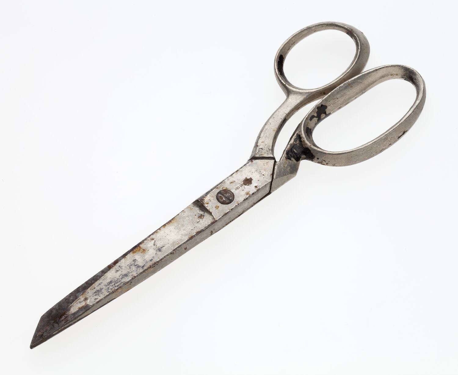 Dressmaker's scissors, made in Italy circa 1970 - 1990. They were found in a basket (SH912406) in Area B1 at Adolph Bruhn & Son's Wood Turners Shop, 283 Coventry Street, South Melbourne. The business was established by Adolph Bruhn circa 1893 in Little Collins Street, Melbourne. Upon his death in 1919 it was then operated by Adolph's son Sophus Christopher Bruhn. Upon Sophus's death in 1959 his son Sophus Walter Bruhn took over the business. In 1970 Sophus reduced the scale of the business and relocated to South Melbourne. The business closed upon Sophus's death in January 1990.