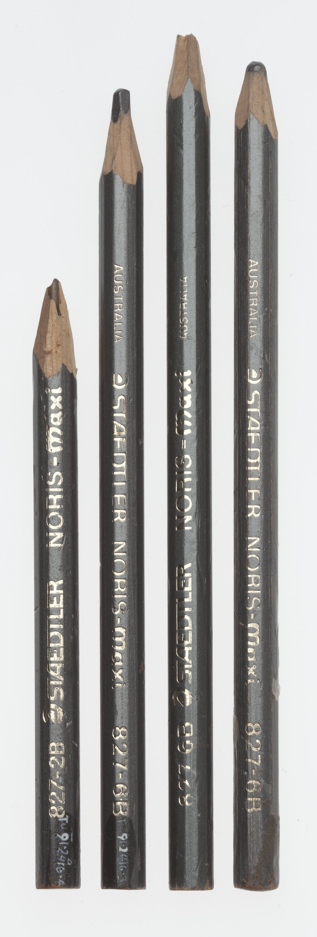 Three pencils inscribed: AUSTRALIA STAEDTLER NORIS-MAXI 827-6B One pencil inscribed .4: 827-2B STAEDTLER NORIS-MAXI.