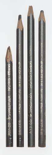 Three 6B pencils and one 2B pencil made by Staedtler, circa 1980s. They were found in a wire basket in Area B1 at Adolph Bruhn & Son's Wood Turners Shop, 283 Coventry Street, South Melbourne. The business was established by Adolph Bruhn circa 1893 in Little Collins Street, Melbourne. Upon his death in 1919 it was then operated by Adolph's son Sophus Christopher Bruhn. Upon Sophus's death in 1959 his son Sophus Walter Bruhn took over the business. In 1970 Sophus reduced the scale of the business and relocated to South Melbourne. The business closed upon Sophus's death in January 1990.