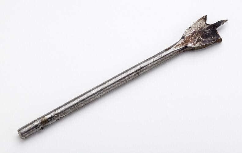 Centre bit, circa 1970-1990. It was found in a wire basket in Area B1 at Adolph Bruhn & Son's Wood Turners Shop, 283 Coventry Street, South Melbourne. The business was established by Adolph Bruhn circa 1893 in Little Collins Street, Melbourne. Upon his death in 1919 it was then operated by Adolph's son Sophus Christopher Bruhn. Upon Sophus's death in 1959 his son Sophus Walter Bruhn took over the business. In 1970 Sophus reduced the scale of the business and relocated to South Melbourne. The business closed upon Sophus's death in January 1990.