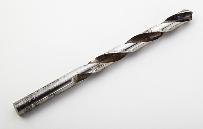 Twist Drill Bit made by Austral, circa 1980. It was used with a power drill and was found in a bit rack (SH 912379) in Area E4 at Adolph Bruhn & Son's Wood Turners Shop, 283 Coventry Street, South Melbourne. The business was established by Adolph Bruhn circa 1893 in Little Collins Street, Melbourne. Upon his death in 1919 it was then operated by Adolph's son Sophus Christopher Bruhn. Upon Sophus's death in 1959 his son Sophus Walter Bruhn took over the business. In 1970 Sophus reduced the scale of the business and relocated to South Melbourne. The business closed upon Sophus's death in January 1990.