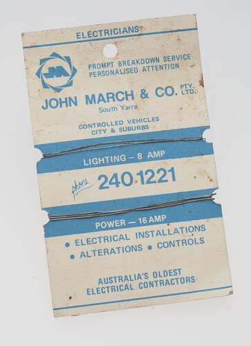 Fuse wire made by John March & Co.Pty.Ltd, circa 1970 - 1990. It was taken from Area B1 at Adolph Bruhn & Son's Wood Turners Shop, 283 Coventry Street, South Melbourne. The business was established by Adolph Bruhn circa 1893 in Little Collins Street, Melbourne. Upon his death in 1919 it was then operated by Adolph's son Sophus Christopher Bruhn. Upon Sophus's death in 1959 his son Sophus Walter Bruhn took over the business. In 1970 Sophus reduced the scale of the business and relocated to South Melbourne. The business closed upon Sophus's death in January 1990.