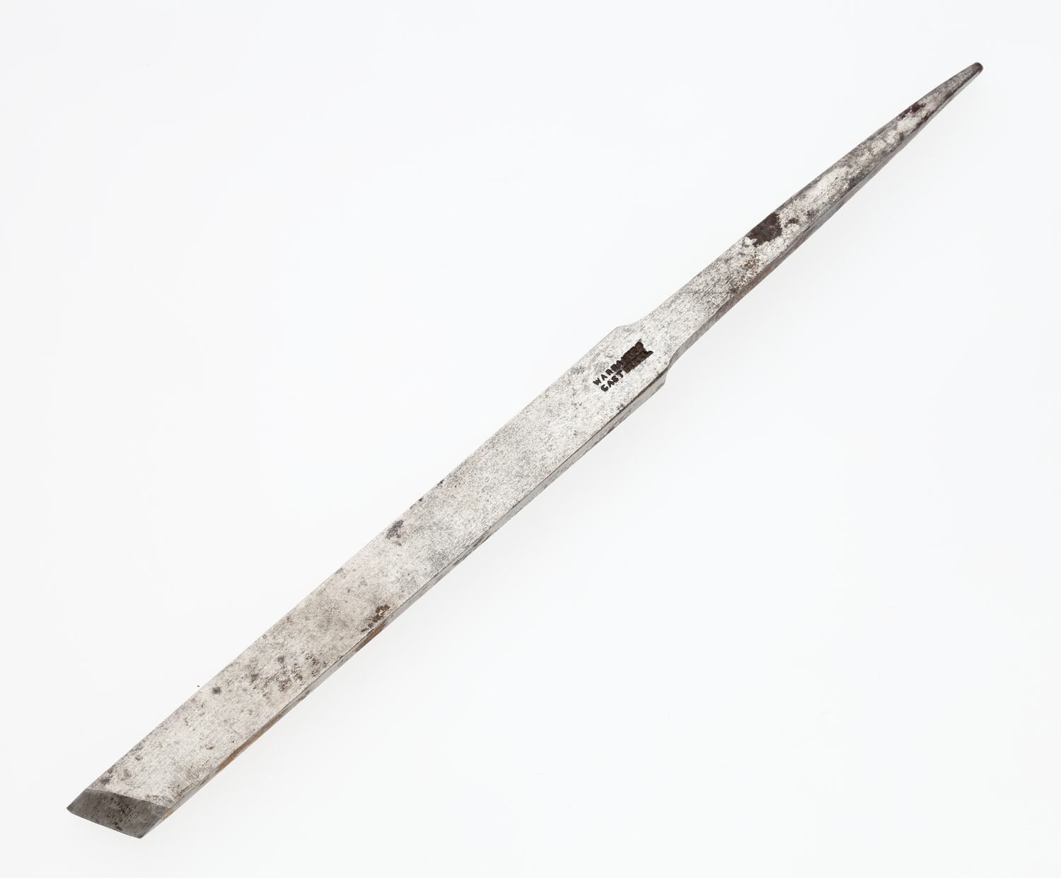 Right skew steel turning chisel. Base of chisel is pointed to enable the tool to be fitted into a wooden handle.