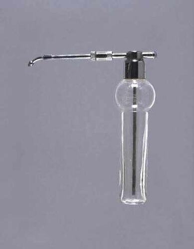 The dental spray is a thin straight-sided glass bottle with a bulb-shaped top. There is a fine metal air pipe leading into the top; this is attached to a metal tube which reaches down into the bottle.