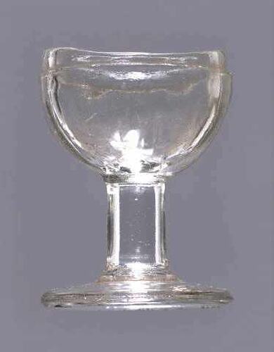 Clear glass eye-bath shaped like a small stem goblet with an oval rim.