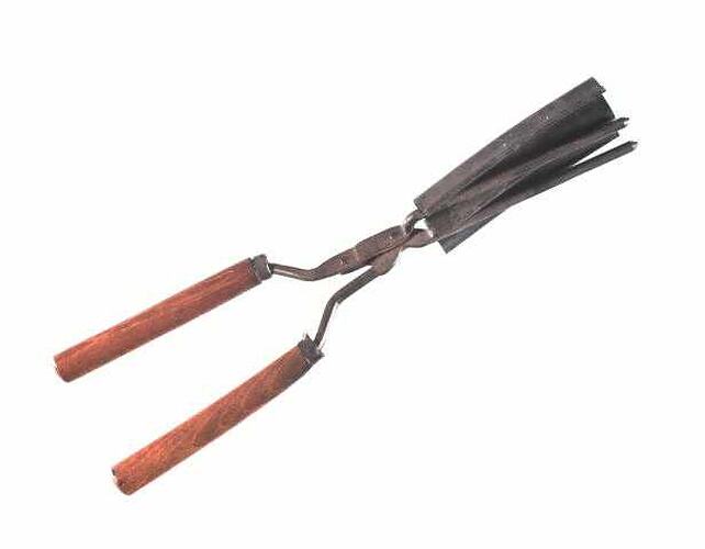 Crimping tongs with wooden handles consist of two prongs and a sheet of metal bent in a "w" shape which lever together.