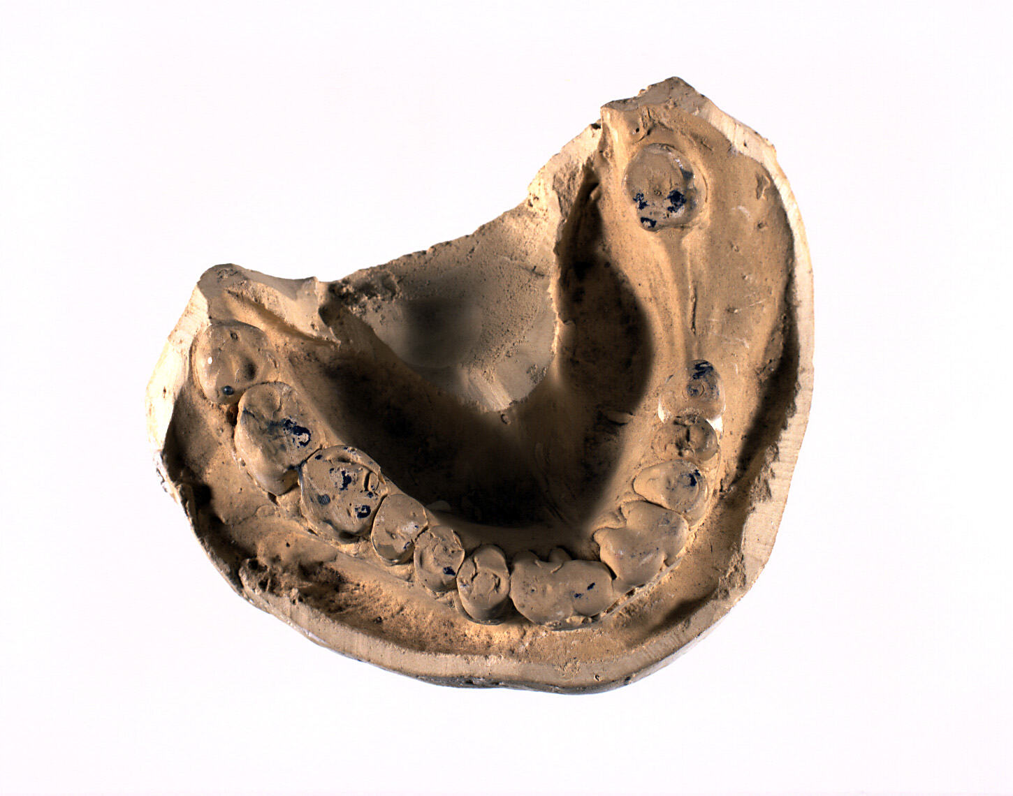 This particular cast is of the bottom jaw of a patient at Lakeside Mental Hospital, Ballarat. It was made by the Dentist at Lakeside Mental Hospital, Ballarat, 1973. A dental cast is a positive copy of the tissues of the jaws, made in an impression, and over which denture bases or other restorations may be fabricated. This would have been part of the patient's regular dental care regime at the Hospital.