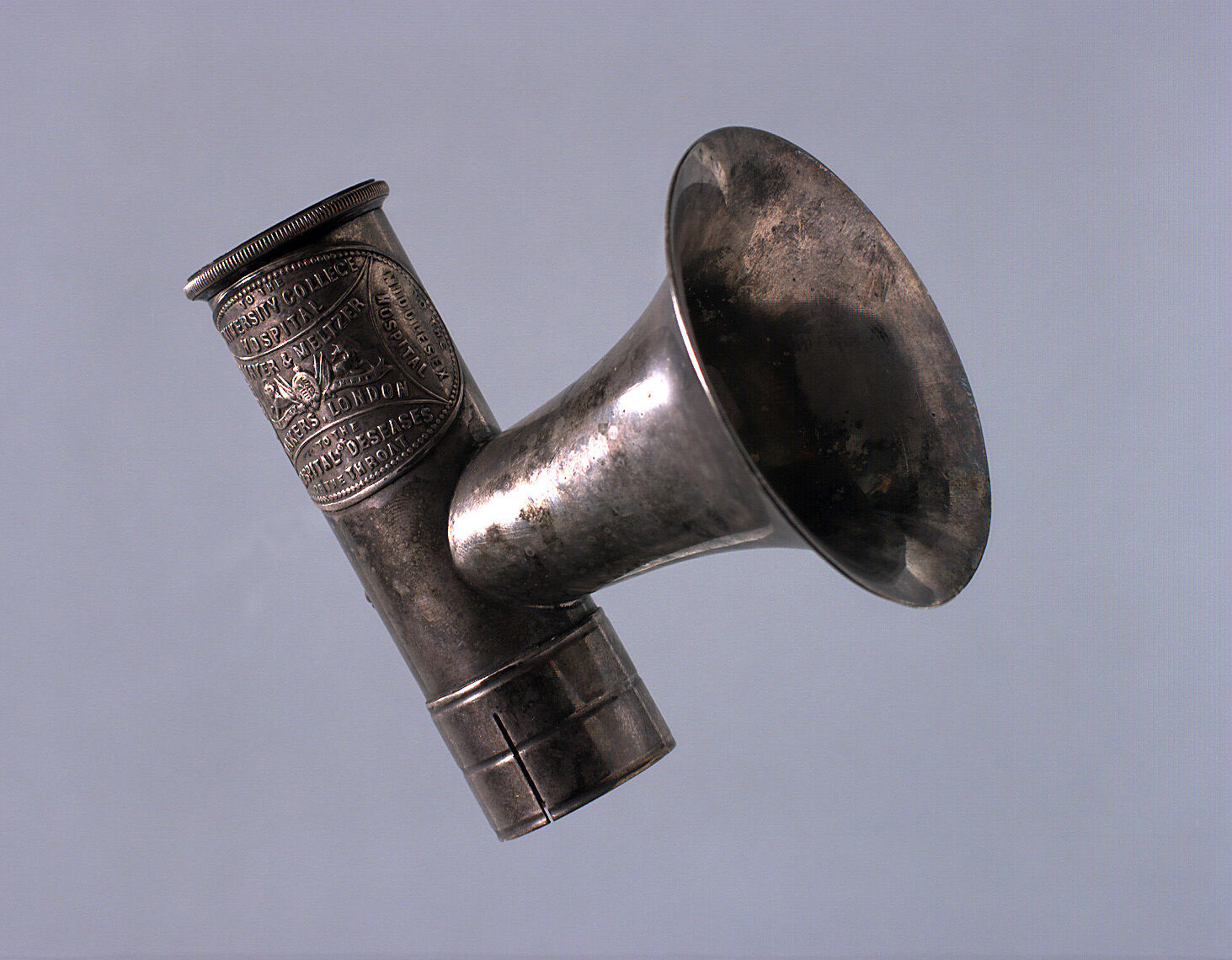 Brunton's auriscope for examining inside of the ear. Consists of a short tube with microscope-like eyehole, with magnifying lens at one end and a broad trumpet inserted in one side. This would have been pointed toward a candle or lamp. Beneath the trumpet opening is an angled mirror for directing light into the ear. There is a small, round viewing hole in the middle of it. The far end of the tube is ridged with fine slits down each side.The separate specula to be inserted in to the ear are fitted onto it. There are two small screws on the trunk, beneath the trumpet which hold the mirror in place. There are two separate spatulas; third is missing. Contained in a purple velvet-lined wooden box covered with black paper.