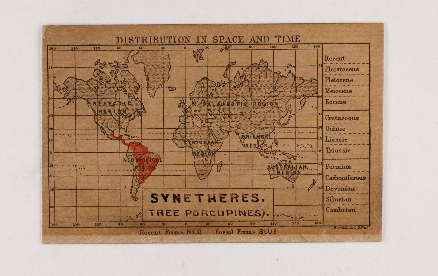 Printed map and text with handwritten species information. Rectangular sepia paper labels with hand-coloured distribution maps used in the gallery to illustrate distribution of species. Red hand-coloured for species area. Fading on bottom where frame may have been. Written in pencil on back in small cursive handwriting is "Synetheres / Tree porcupines"