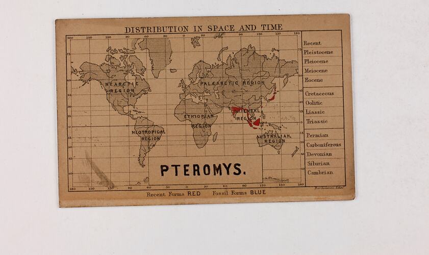 One of 27 hand-coloured species distribution maps used as part of the new interpretation strategy employed by Baldwin Spencer and James Kershaw when the museum re-opened at the Russell Street campus in 1900, These cards and their assigned displays were in McCoy Hall, see attached image of McCoy Hall. the labels can be seen in the glass cabinets.