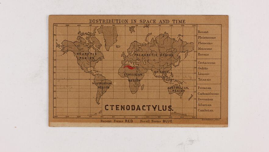 One of 27 hand-coloured species distribution maps used as part of the new interpretation strategy employed by Baldwin Spencer and James Kershaw when the museum re-opened at the Russell Street campus in 1900, These cards and their assigned displays were in McCoy Hall, see attached image of McCoy Hall. the labels can be seen in the glass cabinets.