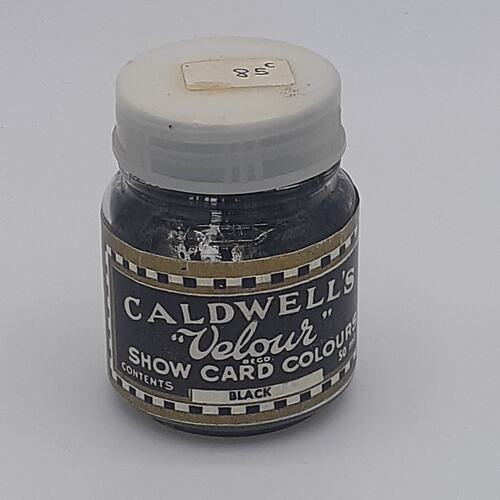 Small pot of 'Caldwell's "Velour" show card colour', black (dried), made by Wiltshire's Pty Ltd, Richmond, Victoria, 1966-2000.