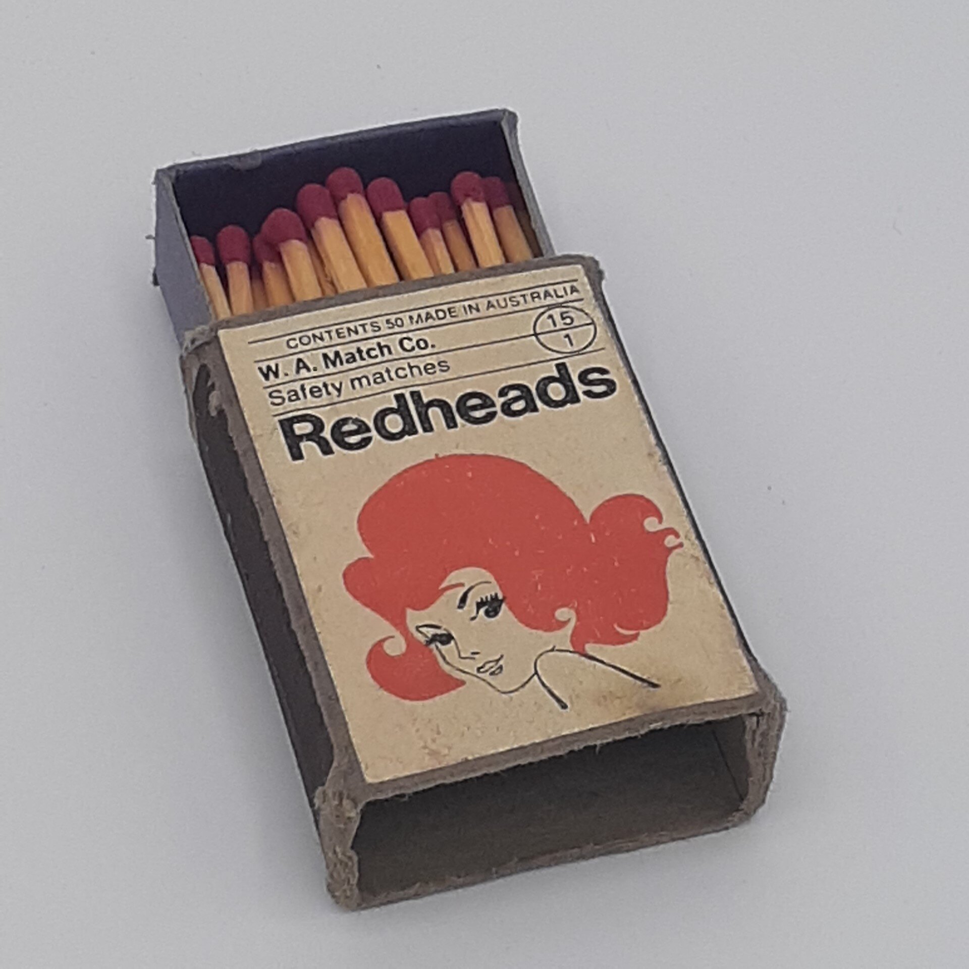 Matchbox and 47 safety matches, 'Redheads' made by W.A.Match Co. Australia, 1971-1975.