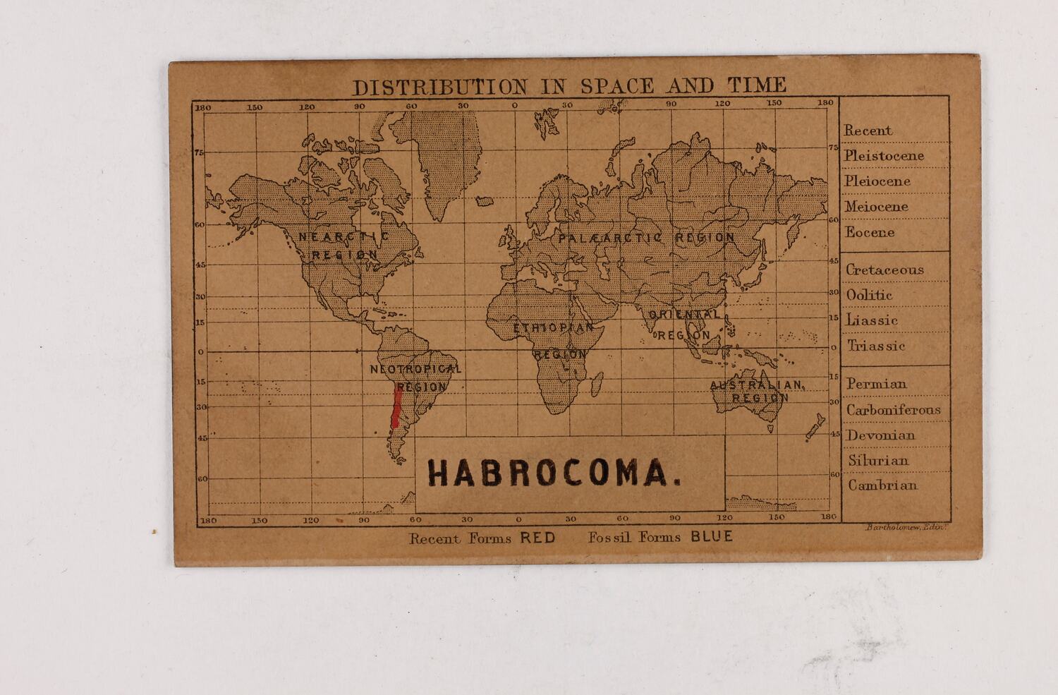 One of 27 hand-coloured species distribution maps used as part of the new interpretation strategy employed by Baldwin Spencer and James Kershaw when the museum re-opened at the Russell Street campus in 1900, These cards and their assigned displays were in McCoy Hall, see attached image of McCoy Hall. the labels can be seen in the glass cabinets.
