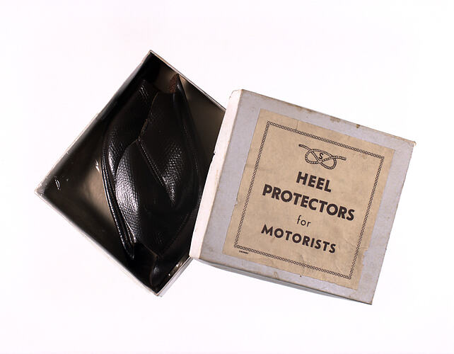 Motorist's leather heel protectors, in box. Made by Simpson's Gloves Factory, Richmond, Victoria, Richmond, circa 1930.