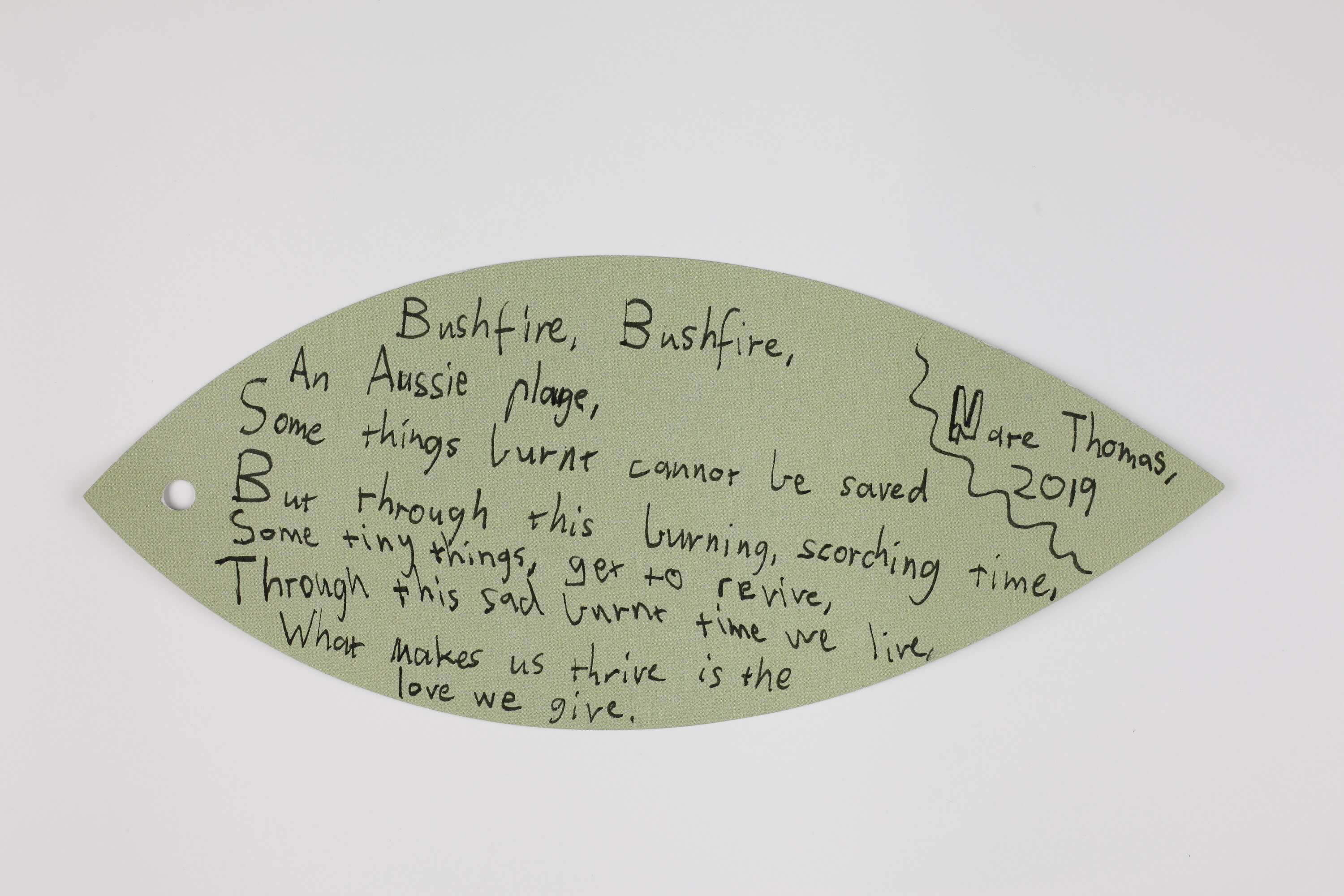Bushfire, Bushfire, / An Aussie plage [sic], / Some things burnt cannot be saved / But through this burning, scorching time, / Some tiny things, get to revive, / Through the sad burnt time we live, / What makes us thrive is the / love we give / Nate Thomas, / 2019