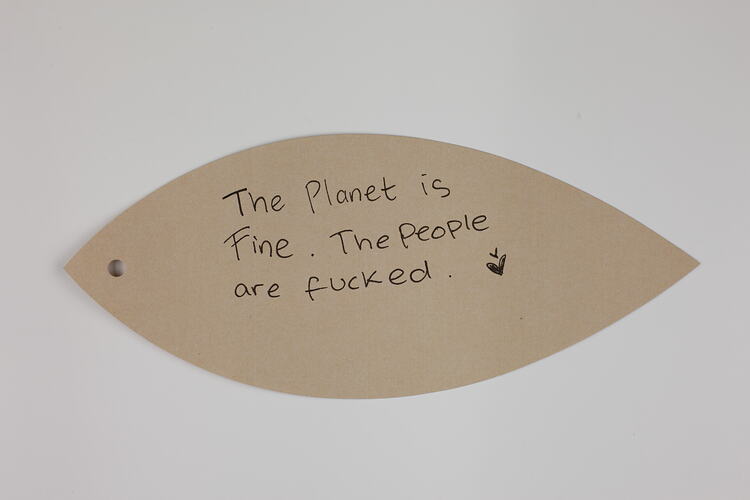 One of twenty paper leaves with hand-written messages selected from the thousands submitted by visitors during the 2019 'From the Heart' exhibition at the Melbourne Museum. Blank paper leaves were available for visitors to the exhibition to write and attach messages to a symbolic Tree of Remembrance.