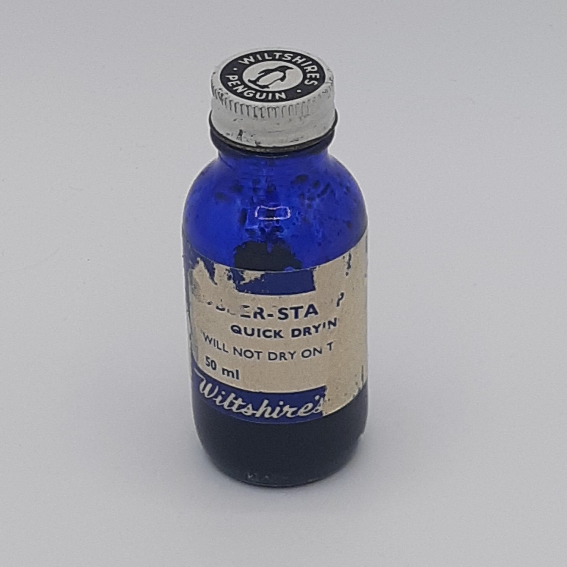 Label: '[RUBB]ER STAMP [IN]K / QUICK DRYING / WILL NOT DRY ON T[?] / 50 ml / Wiltshire's' Bottle cap: 'WILTSHIRES / PENGUIN' Base of bottle: '50 / B12'