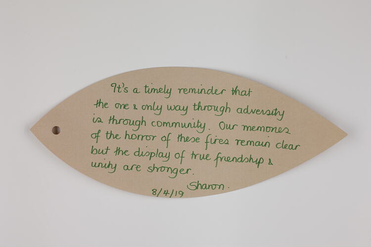 One of twenty paper leaves with hand-written messages selected from the thousands submitted by visitors during the 2019 'From the Heart' exhibition at the Melbourne Museum. Blank paper leaves were available for visitors to the exhibition to write and attach messages to a symbolic Tree of Remembrance.